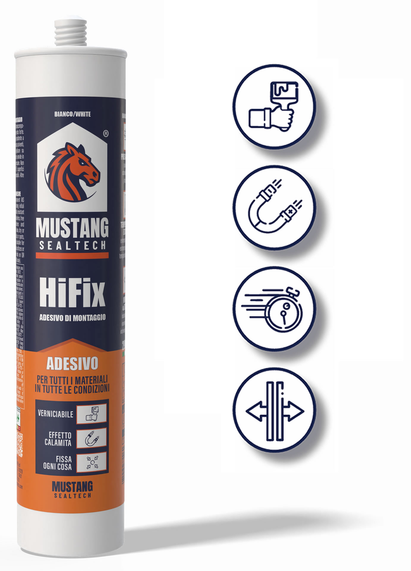 HiFix - FORTE & RAPIDO è un adesivo MS monocomponente a presa iniziale extra forte. Elastico e verniciabile, resistente a UV/umidità. Inodore, senza solventi, siliconi, isocianati. Uso interno/esterno. Applicare su superfici pulite, asciutte o umide in cordoni o punti, poi pressare. Non adatto per PE, PP, PTFE, superfici bituminose o pietre sensibili. Tenere lontano dai bambini.