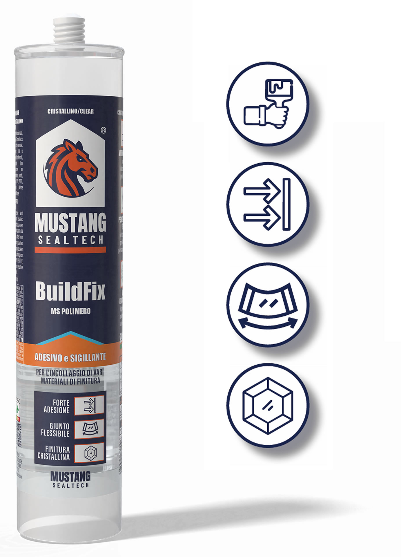 BuildFix - CRISTALLINO Adesivo e sigillante MS professionale, cristallino ed elastico. Garantisce adesione su superfici, anche umide. Verniciabile, resistente a UV e umidità; inodore, privo di solventi, siliconi e isocianati. Uso interno/esterno. Applicare su superfici pulite in cordoni o punti, pressare. Non adatto a PE, PP, PTFE, superfici bituminose o pietre sensibili. Tenere lontano dai bambini