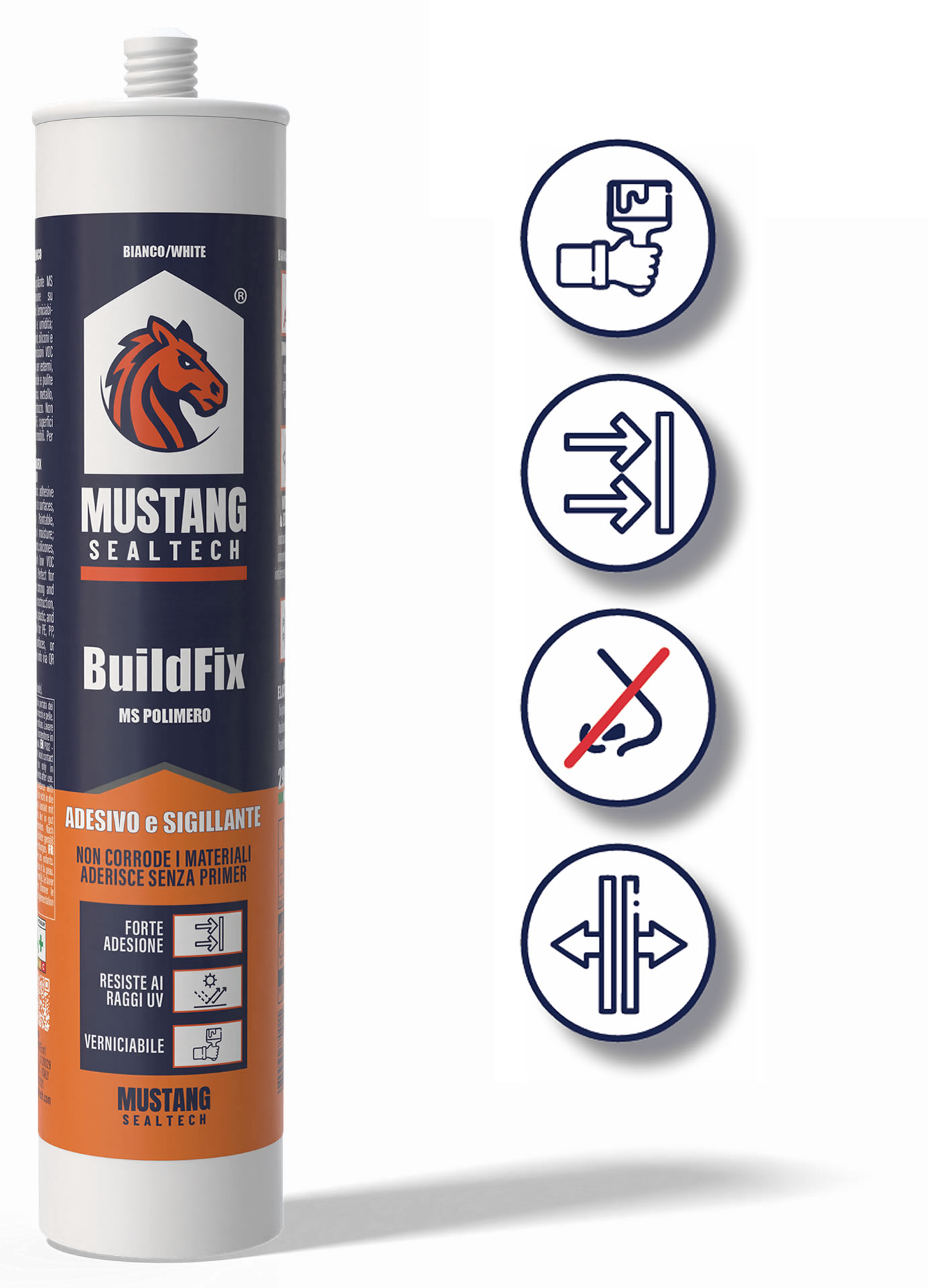 BuildFix - BIANCO / GRIGIO Adesivo e sigillante MS professionale, colorato ed elastico. Garantisce adesione su superfici, anche umide. Verniciabile, resistente a UV e umidità; inodore, privo di solventi, siliconi e isocianati a basse emissioni VOC (Classe A+). Perfetto per esterni durevoli. Assicura sigillature solide e pulite in edilizia, impiantistica, metallo, legno, plastica, calcestruzzo. Non adatto a PE, PP, PTFE, superfici bituminose o pietre sensibili. Tenere lontano dai bambini.