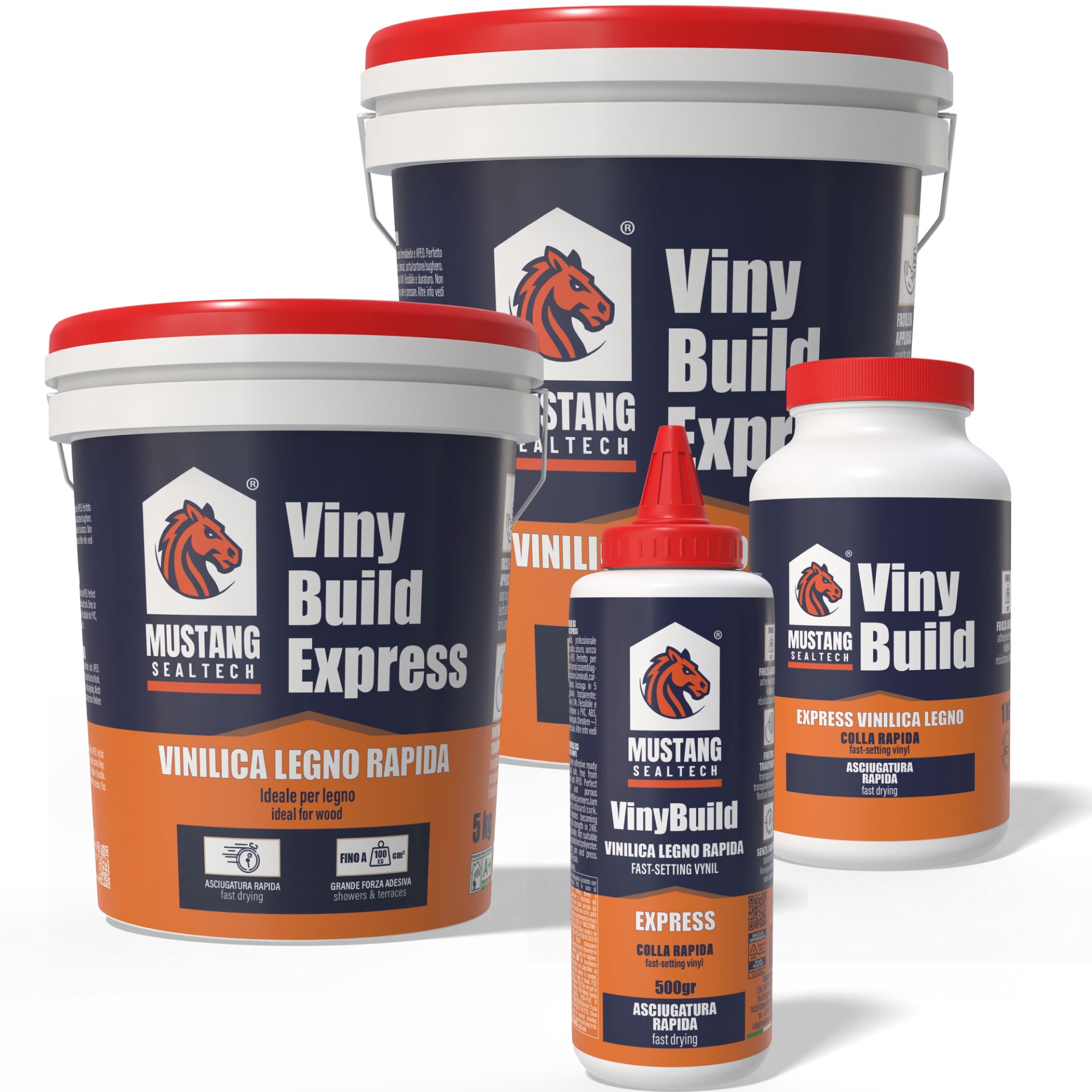 Viny Build Express - Rapido - Adesivo vinilico professionale pronto all'uso: pulito, sicuro, senza formaldeide e APEO. Perfetto per legno e materiali porosi: assemblaggi, impiallacciature, laminati, carta - cartone - sughero. Asciuga in 5 minuti diventando trasparente; presa completa in 24 h. Forza fino a 100 kg/cm², flessibile e duraturo. Non idoneo a PVC, ABS, poliestere non levigato. Stendere ~1 mm, unire e pressare. Tenere lontano dai bambini.