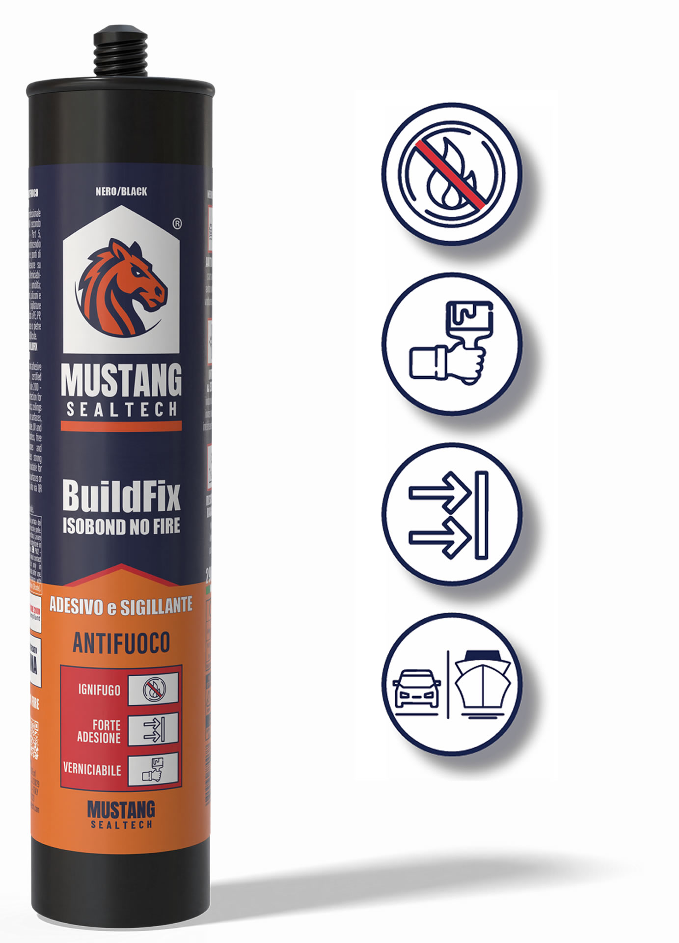 BuildFix - ISOBOND NO FIRE Adesivo e sigillante professionale ignifugo certificato RINA secondo IMO FTP Code 2010 – Part 5, garantisce protezione antincendio per paratie, soffittature e ponti di classe A, B e C. Garantisce adesione su superfici, anche umide. Verniciabile, resistente a UV e umidità; inodore, privo di solventi, siliconi e isocianati. Assicura sigillature solide e pulite. Non adatto a PE, PP, PTFE, superfici bituminose o pietre sensibili. Tenere lontano dai bambini.